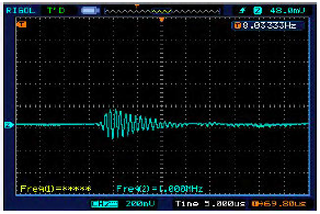 在超聲波流量測量時,首先要對換能器進行驅動,激勵換能器產生振蕩并發出超聲波信號,以下是分別采用1個驅動脈沖、10個驅動脈沖和15個驅動脈沖作為換能器的激勵源,圖2是1個驅動脈沖時,接收端換能器所接收到的波形。可以看出,當一個脈沖驅動時,所接收到的波形比較微弱,波形很不規范。圖3是10個驅動脈沖時,接收端換能器所接收到的波形。波形形狀得到明顯改善。圖4是15個驅動脈沖時,接收端換能器所接收到的波形。