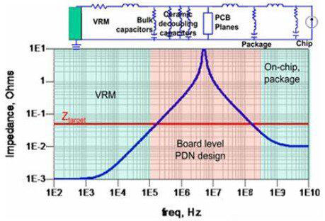 在調(diào)試該故障前先回顧下電源噪聲抑制的原理。如下圖所示,電源分配網(wǎng)絡(luò)中不同的頻段由不同的元件來(lái)抑制噪聲,去耦元件包含電源調(diào)整模塊(VRM)、去耦電容、PCB電源地平面對(duì)、器件封裝和芯片。VRM包含電源芯片及外圍的輸出電容,大約作用于DC到低頻段(100K左右),其等效模型是一個(gè)電阻和一個(gè)電感組成的二元件模型。去耦電容*好使用多個(gè)數(shù)量級(jí)容值的電容配合使用,充分覆蓋中頻段(數(shù)10K到100M左右)。由于布線電感和封裝電感的存在,即時(shí)大量堆砌去耦電容也難以在更高頻起到作用。PCB電源地平面對(duì)形成了一個(gè)平板電容,也具有去耦作用,大約作用在數(shù)十兆。芯片封裝和芯片負(fù)責(zé)高頻段(100M以上),目前的高端器件一般會(huì)在封裝上增加去耦電容,此時(shí)PCB上的去耦范圍可以降低到數(shù)十兆甚至幾兆。因此,在電流負(fù)載不變的情況下,我們只要判斷出電壓噪聲出現(xiàn)在哪個(gè)頻段,那么針對(duì)這個(gè)頻段所對(duì)應(yīng)的去耦元件進(jìn)行優(yōu)化即可。在兩個(gè)去耦元件的相鄰頻段時(shí)兩個(gè)去耦元件會(huì)配合作用,所以在分析去耦元件臨界點(diǎn)時(shí)相鄰頻段的去耦元件也要同時(shí)納入考慮。