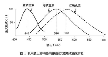 當(dāng)人們做這個(gè)實(shí)驗(yàn)的時(shí)候,有個(gè)驚人的發(fā)現(xiàn),那*是:發(fā)現(xiàn)了視網(wǎng)膜上不同的視錐細(xì)胞對(duì)光譜存在著三種不同的吸收,因而*出現(xiàn)了三種不同的吸收曲線。下面的曲線圖*是其一。只不過(guò)是,該圖把三種不同的視錐細(xì)胞的光譜吸收曲線畫(huà)在同一張圖上了(該圖選自劉家琦,李鳳嗚主編的《實(shí)用眼科學(xué)》第二版.北京人民衛(wèi)生出版社,1999年版.第50頁(yè))。這張圖的意思是,用400nm到700nm的色光去單獨(dú)照射每個(gè)視錐細(xì)胞時(shí),其結(jié)果是:反射回來(lái)的光的數(shù)量并不是一樣多,而是有三種。因而,*繪制出了三種不同的吸收曲線圖。并且,這三條曲線各自占據(jù)了光譜中的藍(lán)區(qū)、綠區(qū)、紅區(qū)的不同位置。因此人們便依據(jù)這一點(diǎn)得出了,視網(wǎng)膜接受外界光線刺激時(shí),可以產(chǎn)生出紅、綠、藍(lán)三種原色的觀點(diǎn)。